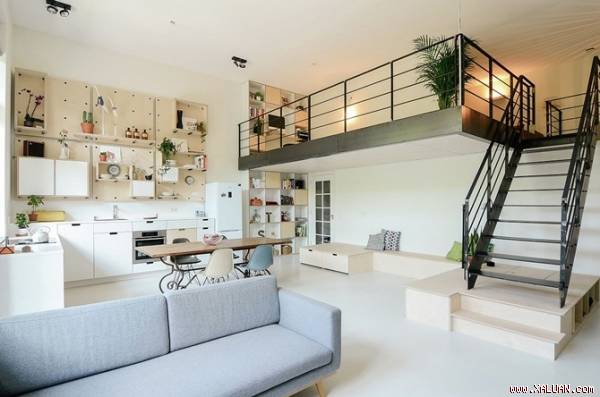 Với mái trần cao bên trong, không gian căn hộ trở nên rộng mở và tươi vui hơn. Tận dụng chiều cao của căn hộ, các kiến trúc sư đã cho xây thêm một tầng lửng nằm giữa phòng khách và phòng ngủ, vừa tăng thêm không gian sinh hoạt mà không phá vỡ sự hài hòa cho không gian chung.