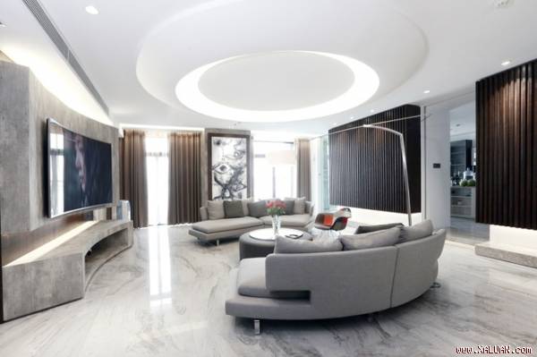 Gia chủ là người thành đạt nhưng kín đáo, muốn thụ hưởng một cách tinh tế, không phô bày. Phòng khách có các chi tiết cong ấn tượng như sofa, trần trang trí, bàn... được bao quanh bởi những bức vách gỗ trang trí.